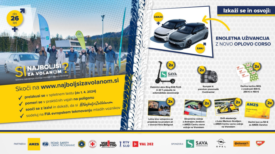 Najboljši in najboljša za volanom 2024 se bosta domov za eno leto odpeljala z novo Oplovo corso, a tudi ostale finaliste in finalistke čakajo kulske nagrade: e-skiro in bon za 20 % popusta na avtomobilsko zavarovanje Zavarovalnice Sava, komplet vrhunskih Continentalovih pnevmatik, darilni boni MOL v vrednosti 400 €, 250 € in 150 €, udeležba na dinamični vožnji z Andrejem Jerebom v AMZS Centru varne vožnje na Vranskem, udeležba na drift akademiji z Luko Markom Grošljem v AMZS Centru varne vožnje na Vranskem, celoletna vstopnica za projekcije Kina Bežigrad ter darilni bon za 50 € za AMZS članstvo.