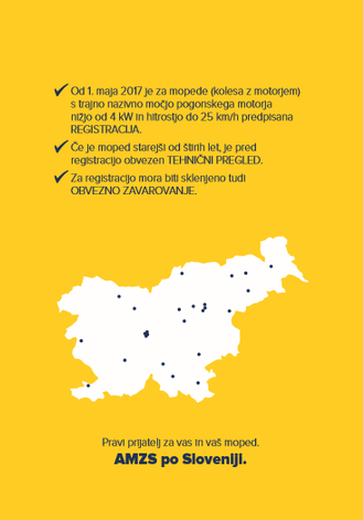 Zakon o dopolnitvah Zakona o motornih vozilih (Uradni list RS, št. 68/16, ZMV-B) določa, da morajo biti mopedi, pri katerih trajna nazivna moč pogonskega motorja ne presega 4 kW in konstrukcijsko določena hitrost ne presega 25 km/h, po 1. 5. 2017 registrirani. Na podlagi 31. člena Zakona o motornih vozilih (Uradni list RS, št. 106/10, 23/15 in 68/16) je za registracijo mopedov potrebno: