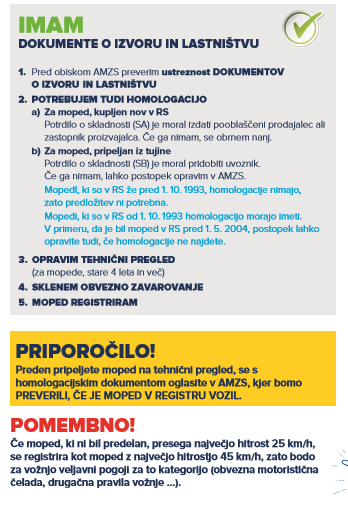 Priporočilo AMZS: Preden pripeljete moped na tehnični pregled, se s homologacijskim dokumentom oglasite v eni od naših poslovalnic za tehnične preglede, kjer bomo preverili, ali je moped v registru vozil.