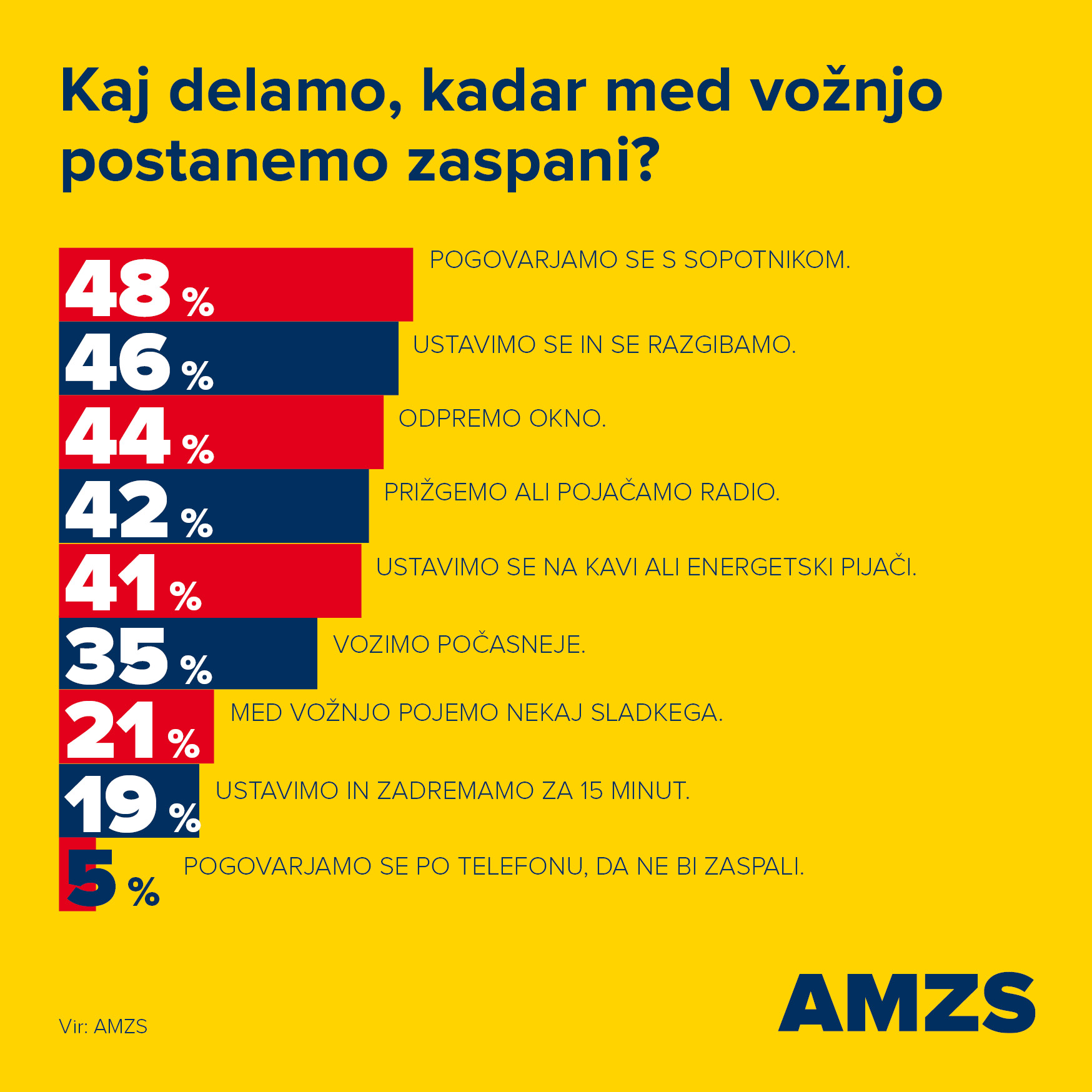 »Če med vožnjo prepoznate zaspanost, se ji ne poskušajte upirati, saj vas lahko spanec v hipu premaga. Čim prej ustavite vozilo na varnem mestu, spijte eno ali dve kavi (kofein začne delovati čez približno 30 minut), zaspite za od 15 do 20 minut in nato nadaljujte z vožnjo,«