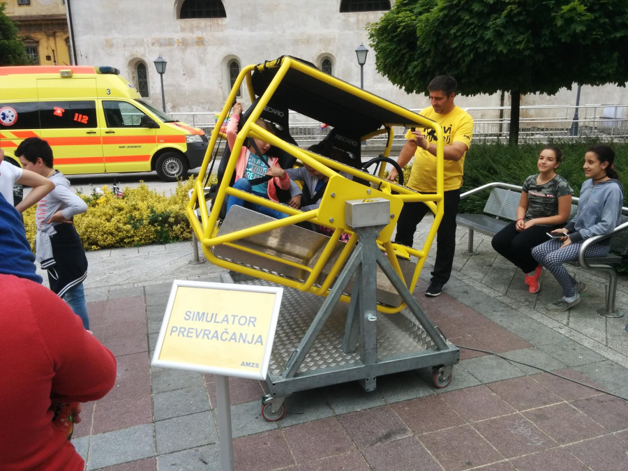 - prevračalnik, prikaz delovanja varnostnega pasu ter reševanje iz prevrnjenega vozila,