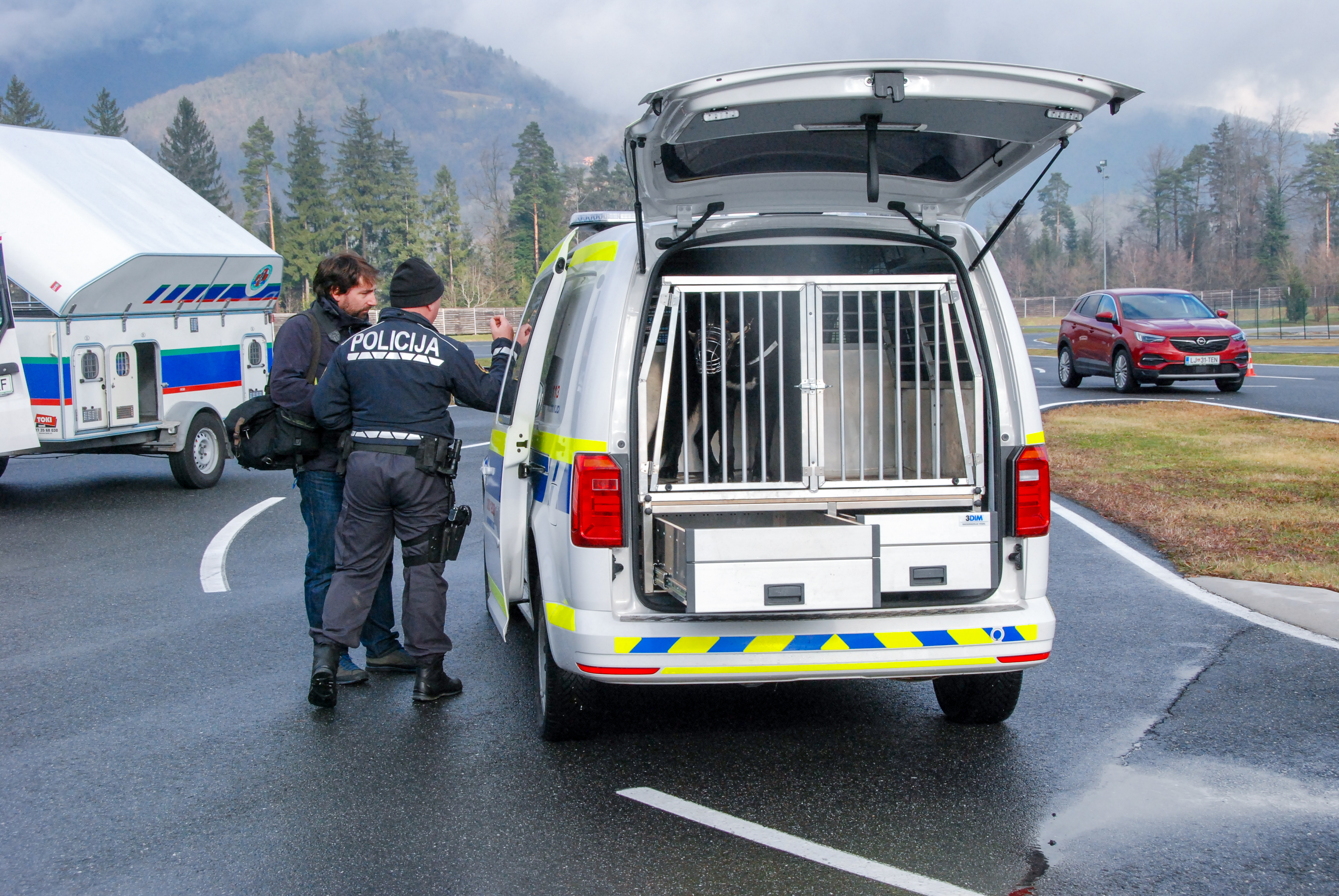 Podobne izkušnje imajo policisti: za prevoz službenih psov uporabljajo posebne bokse, ki so nameščeni v prtljažnik vozila in ustrezno pritrjeni, s čimer je onemogočen nalet boksa. »V zadnjih dveh letih imamo nekaj novih vozil, v katerih so posebej izdelani boksi, kamor lahko v ločene dele naložimo še opremo za službenega psa in s tem preprečujemo tudi nalet te opreme. Nalete še dodatno preprečuje mreža, nameščena v vozilu. Doslej ne beležimo niti ene poškodbe službenega psa na intervencijski vožnji, kar dokazuje, da je pes v boksu, kljub morebitnim nenadnim manevrom, ki so v takšni vožnji mnogokrat nujni, varen,« je način dela policistov na tem področju predstavil komandir policijske postaje vodnikov službenih psov Ljubljana Tadej Nagode.