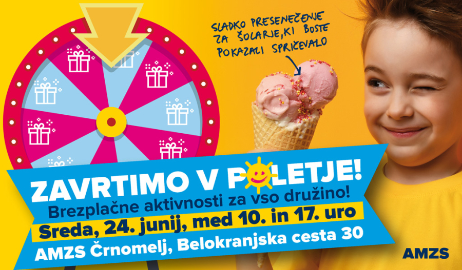 Vabimo vas, da se nam v sredo, 24. junija 2020, med 10. in 17. uro pridružite v AMZS centru Črnomelj. Ob zaključku šolskega leta smo pripravili vrsto brezplačnih aktivnosti za vso družino – kolo sreče, otroški prometni poligon za najmlajše obiskovalce in simulator varne vožnje za malo starejše.