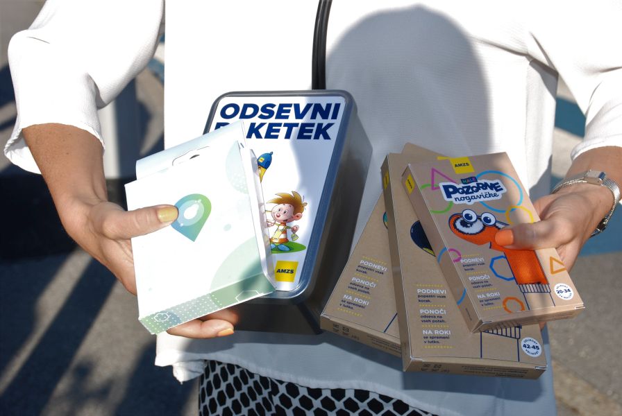 »Pozornim nogavičkam za odrasle, ki se ponašajo v dveh barvnih kombinacijah in dveh različnih velikostih, so se pridružile še male Pozorne nogavičke, namenjene nogicam, velikosti od 20 do 34. Dizajn otroških nogavičk je bil izbran v sklopu natečaja 'Oblikuj svoje Pozorne nogavičke!'. Zmagovalno idejo smo opremili z odsevnimi elementi, ki skrbijo za varne in brezskrbne poti. Tudi te nogavičke so izdelane v Sloveniji. Ker ne vsebujejo patenta na peti, so super nosljive dlje časa, saj z otrokom dobesedno rastejo. Tudi te nogavičke pa se na roki spremenijo v lutko. Zdaj lahko cela družina priredi pravo Pozorno gledališče, pri čemer so ji v pomoč elementi na notranji strani okolju prijazne embalaže. Na voljo so v vseh AMZS centrih in na spletni strani AMZS.«