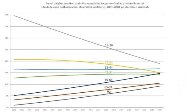 Tudi za leto 2020 smo pripravili analizo povzročiteljev prometnih nesreč med vozniki avtomobilov po starostnih skupinah. Ugotovitve kažejo, da se je večleten trend napredka med mladimi lani nadaljeval, raste pa število povzročiteljev prometnih nesreč med starejšimi od 35 let.