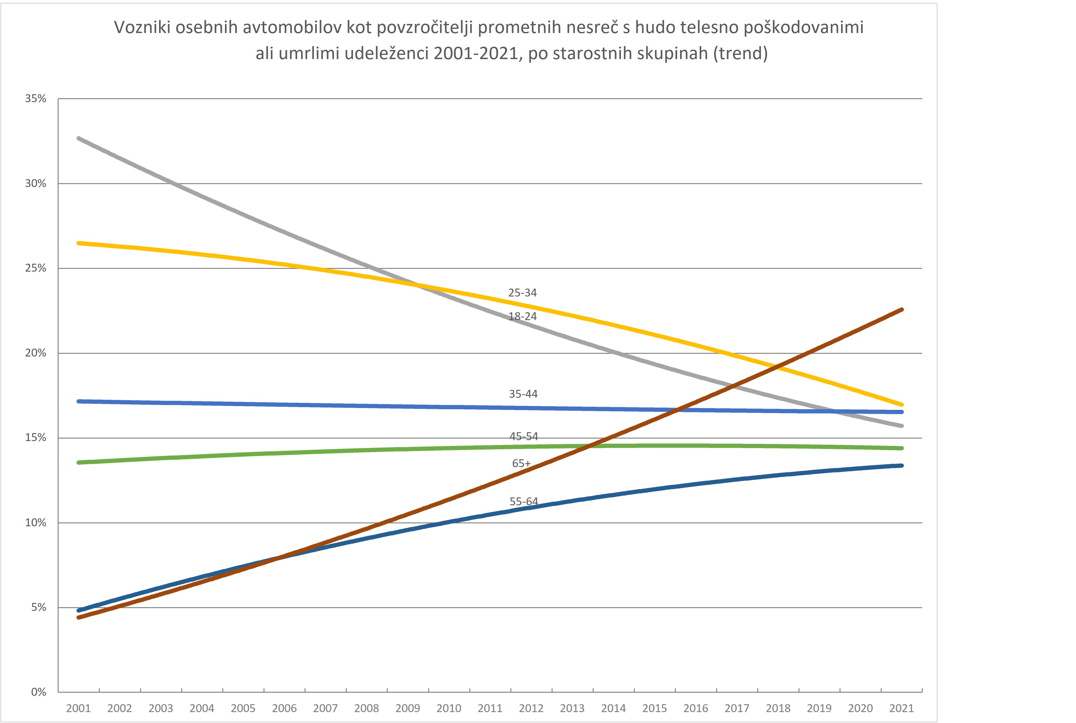 Analiza starosti voznikov avtomobilov kot povzročiteljev prometnih nesreč s hudo telesno poškodbo ali umrlimi udeleženci za dvajsetletno obdobje kaže, da število povzročiteljev najhujših prometnih nesreč med najmlajšimi vozniki avtomobilov vseskozi upada. Prepričani smo, da je tako pomembno zmanjšanje števila povzročiteljev najhujših prometnih nesreč med mladimi vozniki, starimi med 18 in 24 let ter med 25 in 34 let, rezultat dodatnega usposabljanja za voznike začetnike in najrazličnejših drugih preventivnih aktivnosti. Grafični prikaz podatkov nazorno prikazuje, da pri drugih starostnih skupinah – kljub bolj varnim avtomobilom in izboljšani cestni infrastrukturi, a brez sistematičnega dela z vozniki, napredka ni oziroma pri starostni skupini 65+ število povzročiteljev celo strmo narašča.