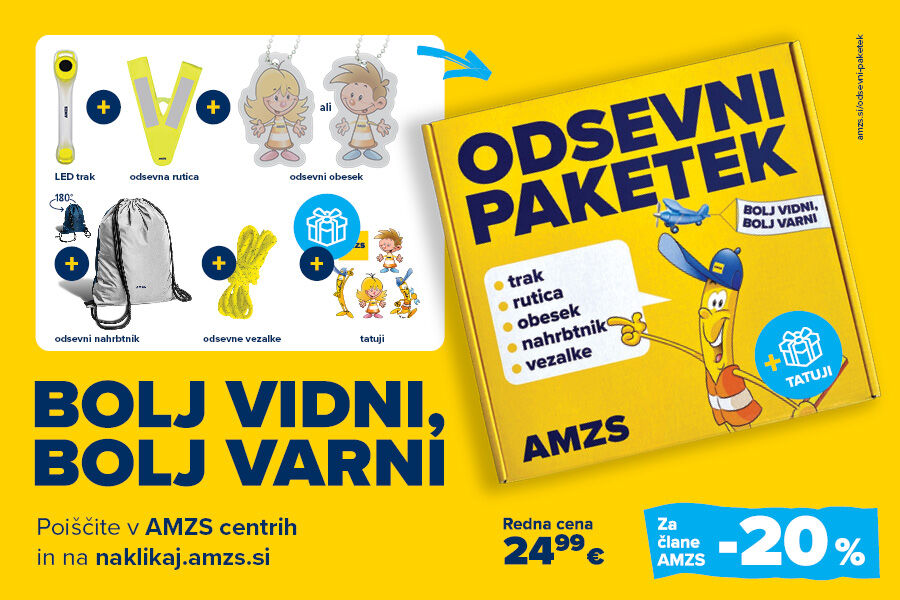 Jesen prinaša krajše dneve, deževni in megleni dnevi pa slabšo vidnost pešcev, kolesarjev, skiroistov …, zato AMZS izpostavlja pomen uporabe odsevnih teles in svetlih oblačil. V ta namen je AMZS letos prenovil Odsevni paketek, v katerem so izbrani izdelki, ki pripomorejo k boljši vidnosti in varnosti ne le najmlajših, temveč vseh udeležencev v prometu. AMZS Odsevni paketek, kot tudi AMZS Pozorne nogavičke, so na voljo v AMZS centrih in v spletni trgovini.