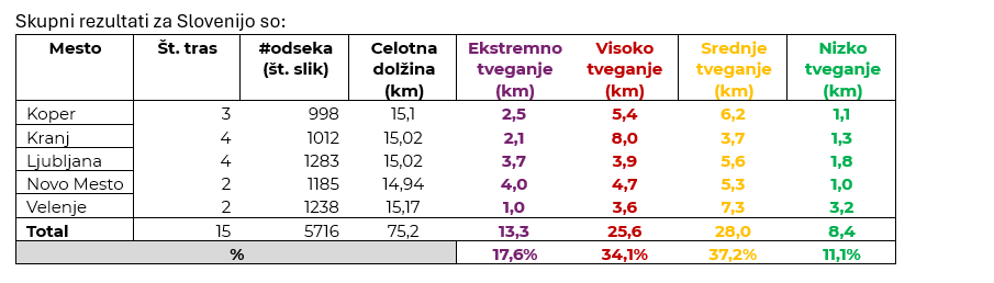V poročilu je ocenjenih 75 kilometrov cest z različnimi tipologijami v petih različnih mestih, v vsakem v dolžini 15 kilometrov. Kljub temu, da ima Slovenija dobro strukturno podlago za kolesarjenje, ugotovitve kažejo, da je za vsakodnevne uporabnike kolesarskih poti še veliko prostora za izboljšave. Več kot 51 odstotkov celotnega 75-kilometrskega omrežja je ocenjenega z “visoko” ali “ekstremno” stopnjo tveganja. Čeprav 50 odstotkov omrežja predstavljajo ločene kolesarske poti, je 27 odstotkov takšnih, na katerih so si kolesarji primorani deliti cesto z motornimi vozili, kar lahko vodi v neposredne konflikte. Približno 90 odstotkov analizirane infrastrukture se lahko klasificira kot “ozka” (samo 1-2 metra širine). Takšna širina ne omogoče dvosmernega prometa, enostavnega prehitevanja ali uporabe vse pogosteje prisotnih širokih vozil, kot so na primer tovorna kolesa.