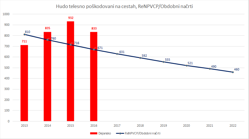 Iz grafa je razvidno, da je število hudo telesno poškodovanih leta 2016 sicer manjše kot leto poprej, so pa zadnja tri leta slabša od leta 2013, ki bi nam lahko bil izziv. Glede na postavljene cilje Obdobnega načrta za leto 2016 pa je razvidno, da se je na slovenskih cestah poškodovalo 162 oseb več.