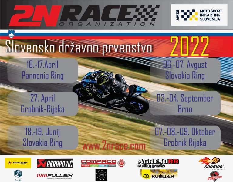 Avto-moto zveza Slovenije je skupaj z društvom 2n'race, ki organizira dirke državnega prvenstva v cestno hitrostnem motociklizmu, pripravila koledar dirk za leto 2022. Državno prvenstvo bo prihodnje leto obsegalo šest dirk na štirih različnih prizoriščih na Madžarskem, Hrvaškem, Slovaškem in Češkem. Začelo se bo sredi aprila na dirkališču Pannonia Ring, zadnja šesta dirka, po kateri bodo znani državni prvaki v posameznih razredih, pa je načrtovana v začetku oktobra na Grobniku. AMZS in društvo 2n'race vse zainteresirane opozarjata, da se lahko koledar dirk za leto 2022 še spremeni zaradi ukrepov v zvezi z epidemijo koronavirusa ali zaradi kakšnih drugih tehtnih in utemeljenih razlogov, ki bi onemogočali organizacijo posameznih preizkušenj na predvidenih prizoriščih. Seznam načrtovanih dirk: