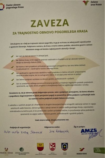 V petek, 25. novembra, se je začela obsežna akcija pogozdovanja območja, ki ga je julija silovito prizadejal uničujoč gozdni požar, in prvi dan akcije je bil prisoten tudi AMZS. V odsotnosti Tima Gajserja, ki ima na Japonskem obveznosti s proizvajalcem motociklov Hondo in opremljevalci, je krovno nacionalno zvezo za motošport in karting ob začetku akcije zastopal njen generalni sekretar Jure Kostanjšek. Na Cerju je podpisal Zavezo za trajnostno obnovo pogorelega Krasa ter podprl projekt Zeleno srce Krasa, h katerima je pristopil AMZS. Sledil je začetek pogozdovanja, ki je potekal pod budnimi očesi strokovnjakov Zavoda za gozdove Slovenije. Številnim predstavniki podjetij in civilnodružbenih organizacij, ki so pristopili k Zavezi za trajnostno obnovo Krasa ter k projektu Zeleno srce Krasa, so se pridružili tudi nekateri prostovoljci. Sadili so sadike črnega hrasta, ki sicer v tem okolju in na kraških tleh dobro uspeva ter je zelo trpežen v različnih vremenskih pogojih.