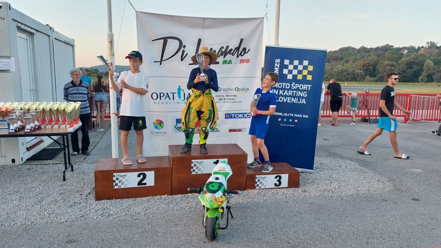 Tristan Rupelli (Italija) je v izjemni formi in tekmeci v konkurenci miniGP 12 mu vnovič niso segli do kolen. Obe vožnji je bil odličen, vozil je kot po tirnicah in še na tretji zaporedni dirki za državno prvenstvo prišel do skupne zmage. Od najbližjega konkurenta Eneja Krševana (GAS Vrtejba) je bil v obeh vožnjah hitrejši za 20 sekund. Dirkač iz Ajdovščine, ki nastopa tudi v italijanskem prvenstvu Aprilie, sicer dirke za državo prvenstvo izkorišča za treninge, je končal na drugem mestu. Na tretje mesto pa se je vnovič uvrstil Uroš Petrič (GAS Vrtejba).