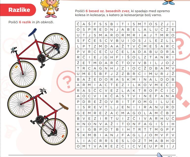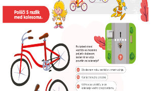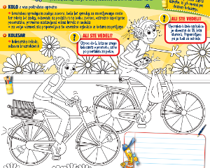 Poznamo celo vrsto koles. Izbrali smo dve, ki sta na videz zelo podobni, pa vendar nista enaki. Lahko poiščeš razlike med njima? Prav tako poišči odgovora na dve vprašanji, kako se obnašamo v prometu, kadar se vozimo s kolesom. Vprašanji nista težki, pravilna odgovora pa si zapomni, saj ti bosta prišla zelo prav, ko se boš vozil s kolesom.
