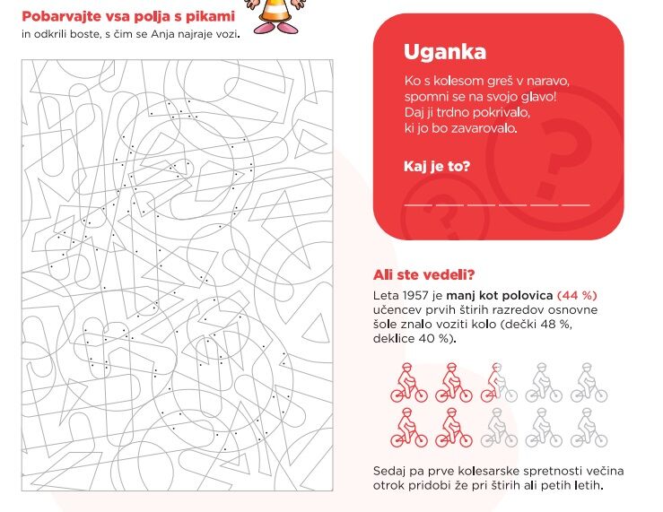 Pobarvaj vsa polja s pikami in odkril boš, s čim se AMZS super junakinja Anja najraje vozi. Reši tudi uganko. Ko s kolesom greš v naravo, spomni se na svojo glavo! Daj ji trdno pokrivalo, ki jo bo zavarovalo. Kaj je to?