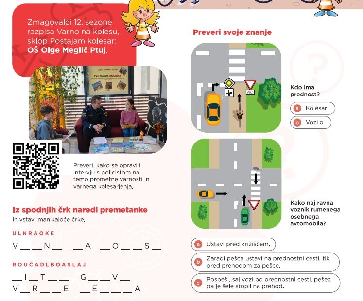 Kdo ima prvi prednost v križišču, v katerem ni semaforjev in se mu približuje tvoj vrstnik na kolesu, kdo bo križišče prevozil zadnji? Reši zastavljeni uganki in se pouči, kdaj so se otroci naučili voziti kolo nekoč in kdaj se ga naučijo voziti danes. Reši uganki, pošlji rešitvi in morda prideš do lepe nagrade.