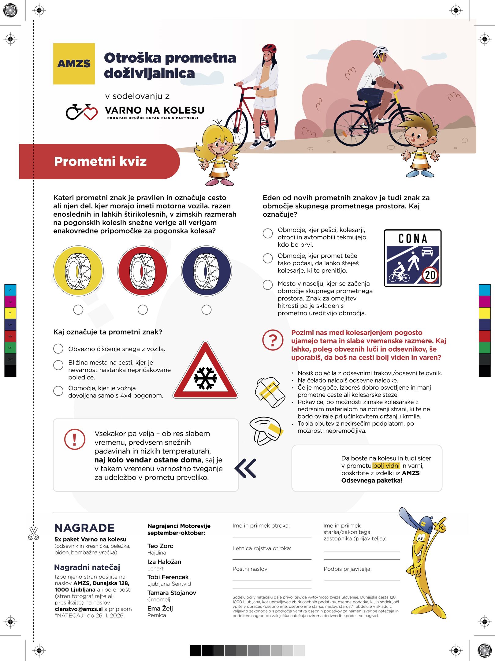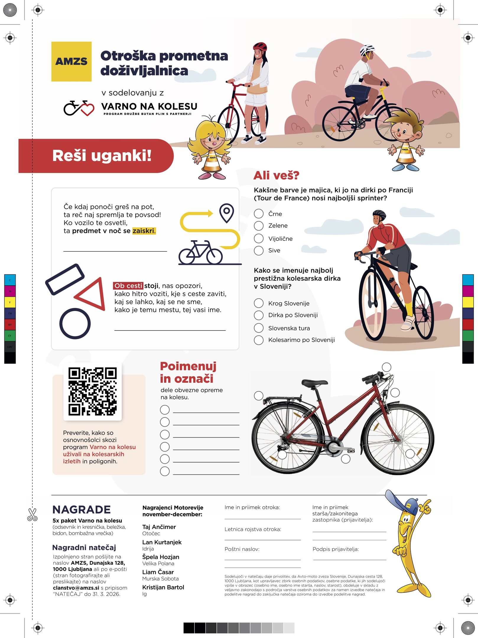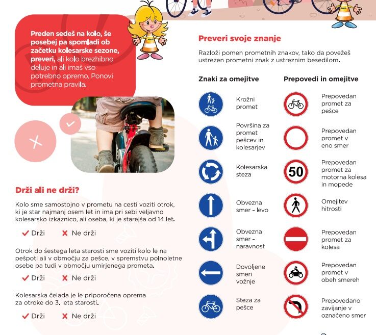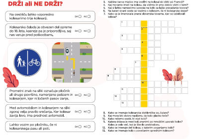Po kateri strani vozišča vozimo, ko smo na kolesu? Kdo vse mora uporabljati čelado pri vožnji s kolesom? Kakšna oblačila nosimo, kadar se stemni, da smo bolj vidni? Pred teboj je kar nekaj vprašanj, ki čakajo na odgovor. Se upaš spoprijeti z njimi? Le pogumno se jih loti, če pa si v zadregi in ne poznaš odgovora, pa povprašaj za pomoč tiste, ki že imajo izkušnje pri vožnji s kolesom v prometu in jim zaupaš.