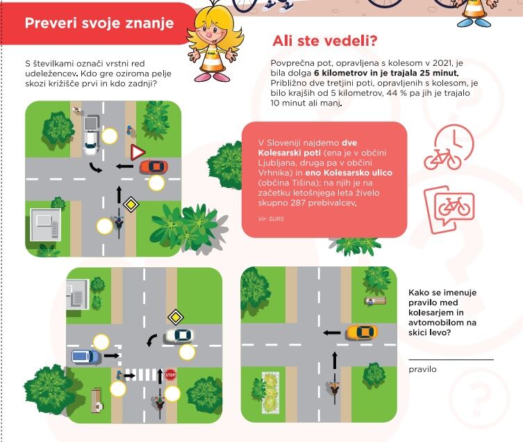 Si vedel, da je bila povprečna pot, opravljena s kolesom v letu 2021, dolga šest kilometrov in je trajala 25 minut? Približno dve tretjini poti, opravljenih s kolesom, je bilo krajših od pet kilometrov, 44 % pa jih je trajalo deset minut ali manj. S številkami označi vrstni red udeležencev v prometu. Kdo gre oz. pelje skozi križišče prvi in kdo zadnji ter kdo istočasno?