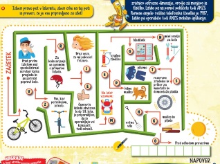 Jan je star 11 let in opravil je kolesarski izpit. Sedaj se lahko samostojno odpravi na pot s kolesom. Malce pa je pozabil, kaj pomenijo prometni znaki. Pomagaj mu najti pravo pot iz labirinta: pravilno ga usmeri "na razpotjih" in ga varno pospremi do cilja.