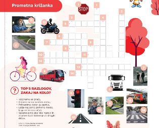 Z nogami zavrtimo, z rokami se držimo, navzdol se hitro pelje, navzgor počasi melje, usta odpremo v nasmeh, mušice gostimo na zobeh. Kaj je to? Poleg uganke reši tudi rebus in preveri svoje znanje prometnih pravil.